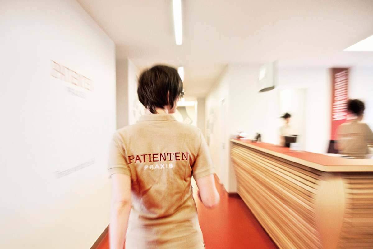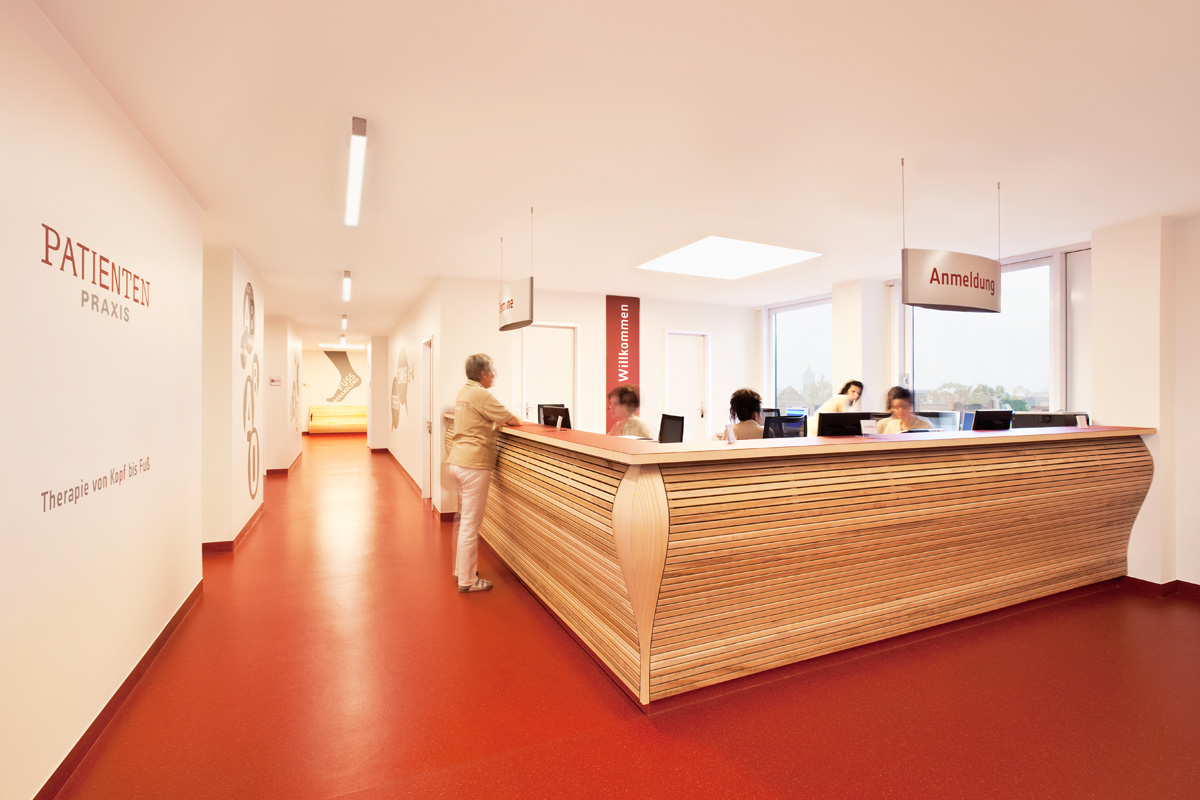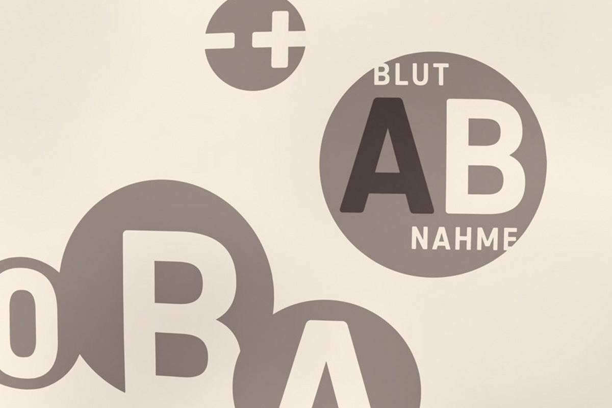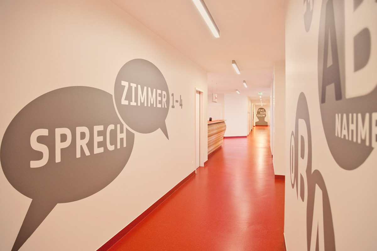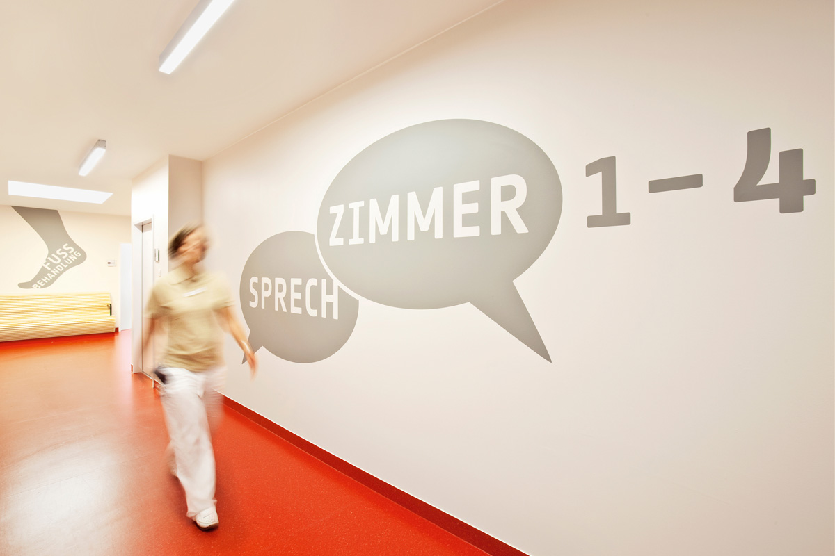 Each illness is individual, and so too are the individual letters of the logo made up of several typefaces. Here the patient comes first, and the practice, as basis and subheading, is the place of treatment and help. An interdisciplinary group of consultants treats its patients from head to toe. Thus the tagline “Treatment from head to toe” reflects both the core competency and distinguishing feature. This aspect becomes part of the corporate design in the signage system, which visually designates the functions of the different rooms. The impression on entering the practice is one of openness and modernity. Hence, the signage in the various parts of the practice is wall design and orientation system in one.