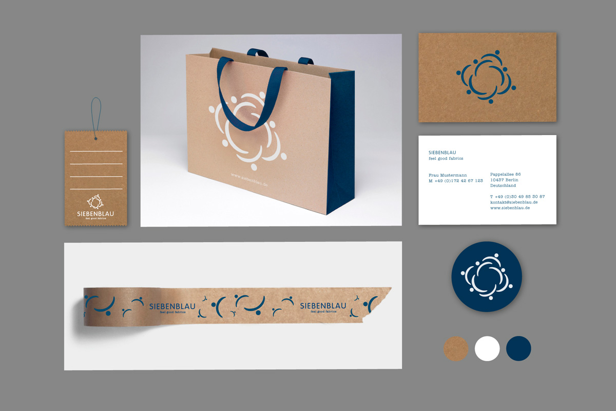 For the first fully certified organic and fair-trade textile shop in Berlin a new corporate design was conceived and developed. The trademark stands for both an abstract visualisation of cotton as well as for the seven stylized people that form into a circle as metaphor for the earth’s globe. Sustainability in the positioning of the business model becomes the expression of identity and approach.